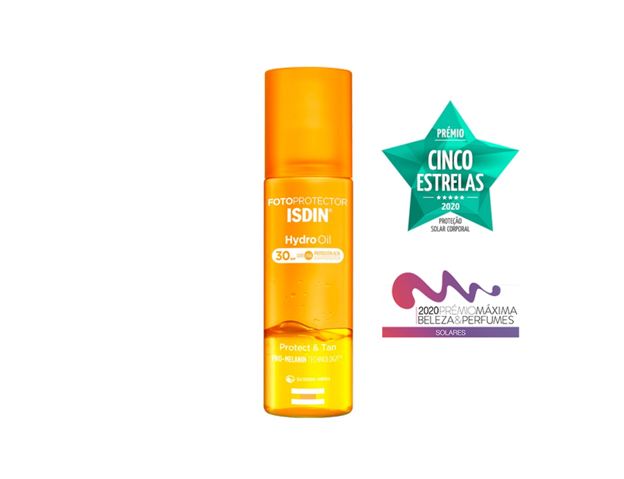 Loção oleoaquosa bifásica de dupla ação: PROTEGE Proteção elevada UVB e UVA FPS30. BRONZEIA Pro-Melanin Technology oferece uma proteção natural, potenciando o bronzeado em