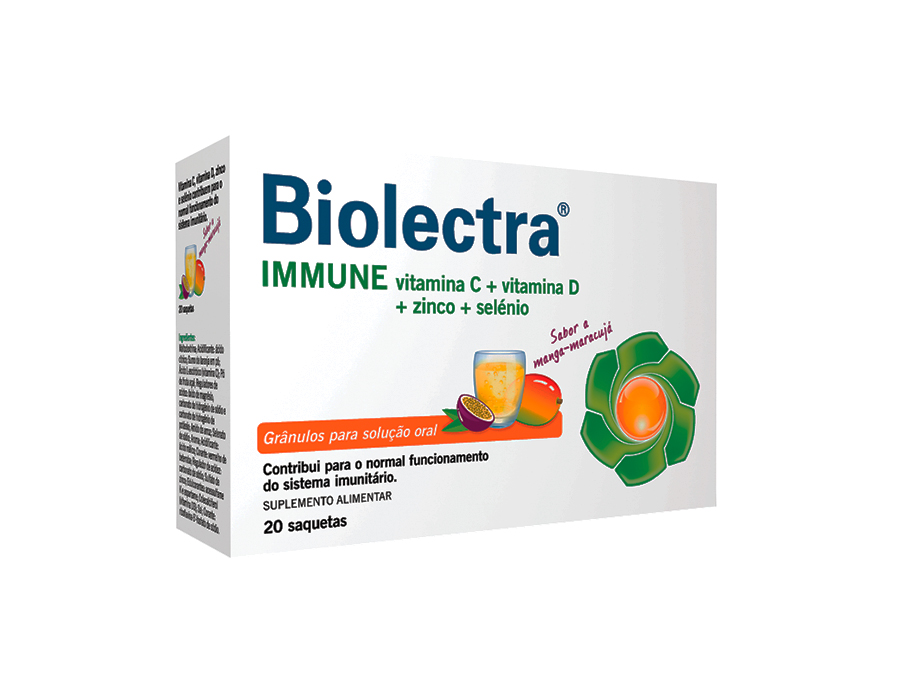 Biolectra Immune 20 Saquetas, com sabor a manga-maracujá, rico em vitaminas C e D, e em zinco e selénio, contribui para o normal funcionamen